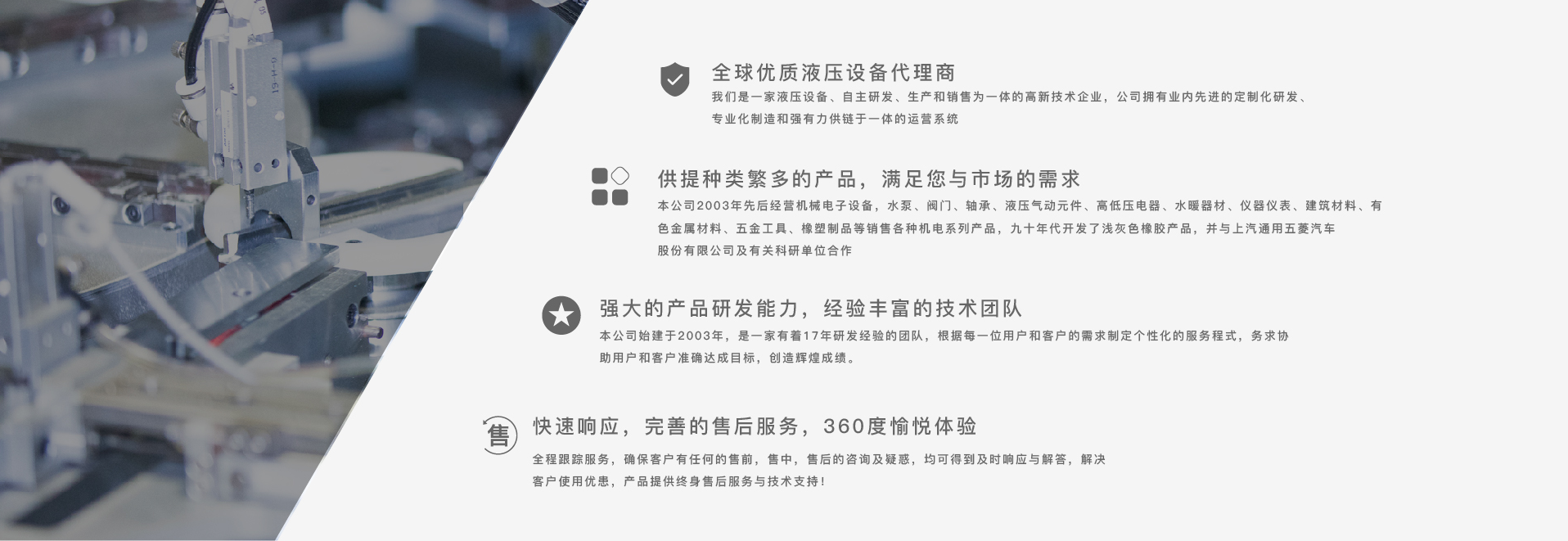 自主研發制造品牌威力士占地面積1.2萬平方米,員工60多人,其中科技人員18人;擁有各類高精機床、試驗儀器檢測設備70余臺。主要從事生產與研發各類液壓系統;各種標準和非標冶金設備液壓缸、工程液壓缸、車輛液壓缸、氣缸、液壓軟管總成、液壓油路集成塊等設計制造;承接各種進口、國產液壓泵、液壓馬達、閥、缸的修理,液壓機械設備維護和修復,以及進出口業務。 公司一貫秉承“以管理促效益,以質量謀發展”的質量方針,以優質的產品、合理的價格、周到的服務和便捷的交貨,在行業中享有較高的聲譽。公司管理體制健全,制造設備精良,質量保證體系完善,已建立了現代化企業管理制度,通過IS09001:2008質量管理體系認證。